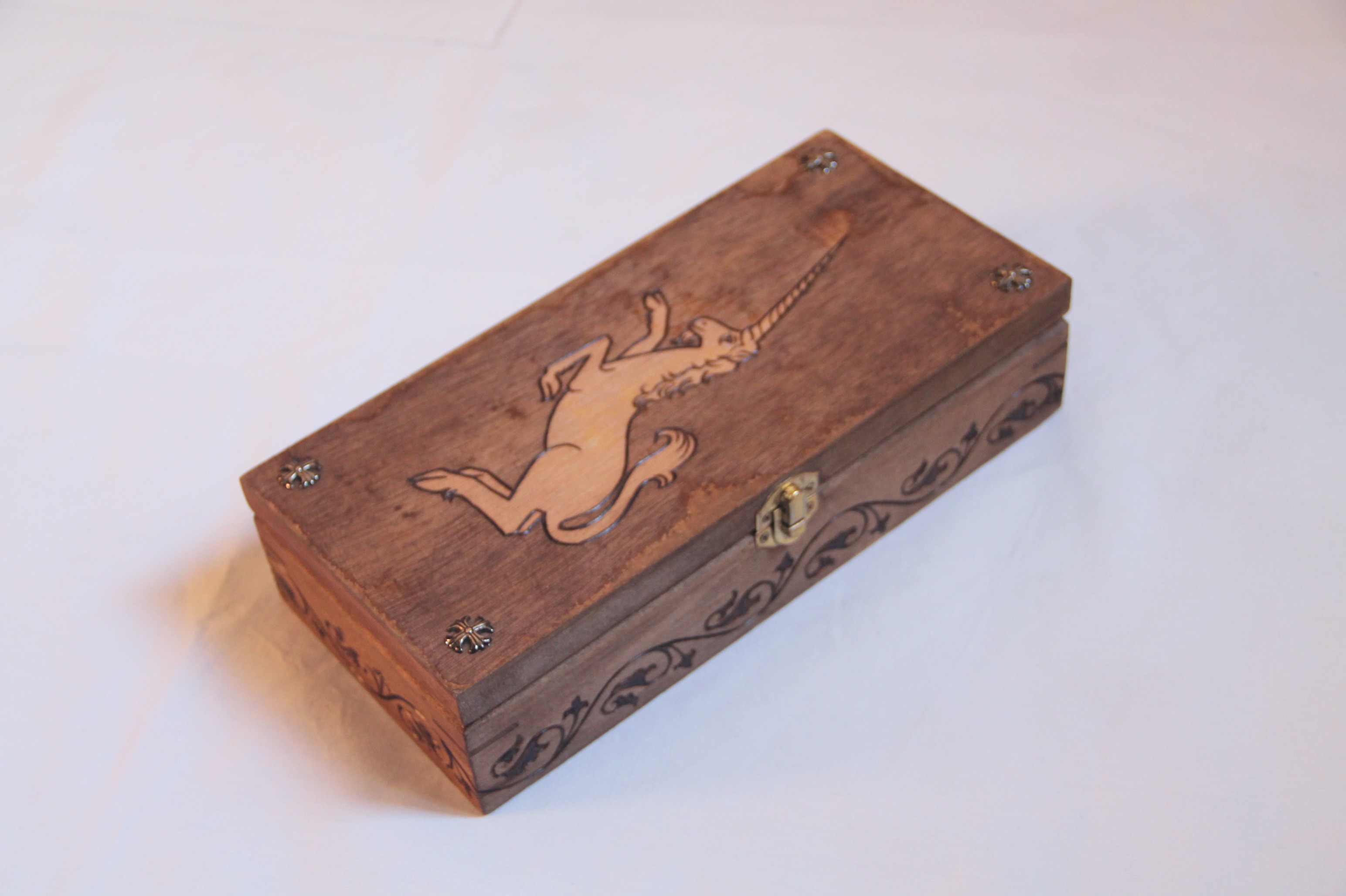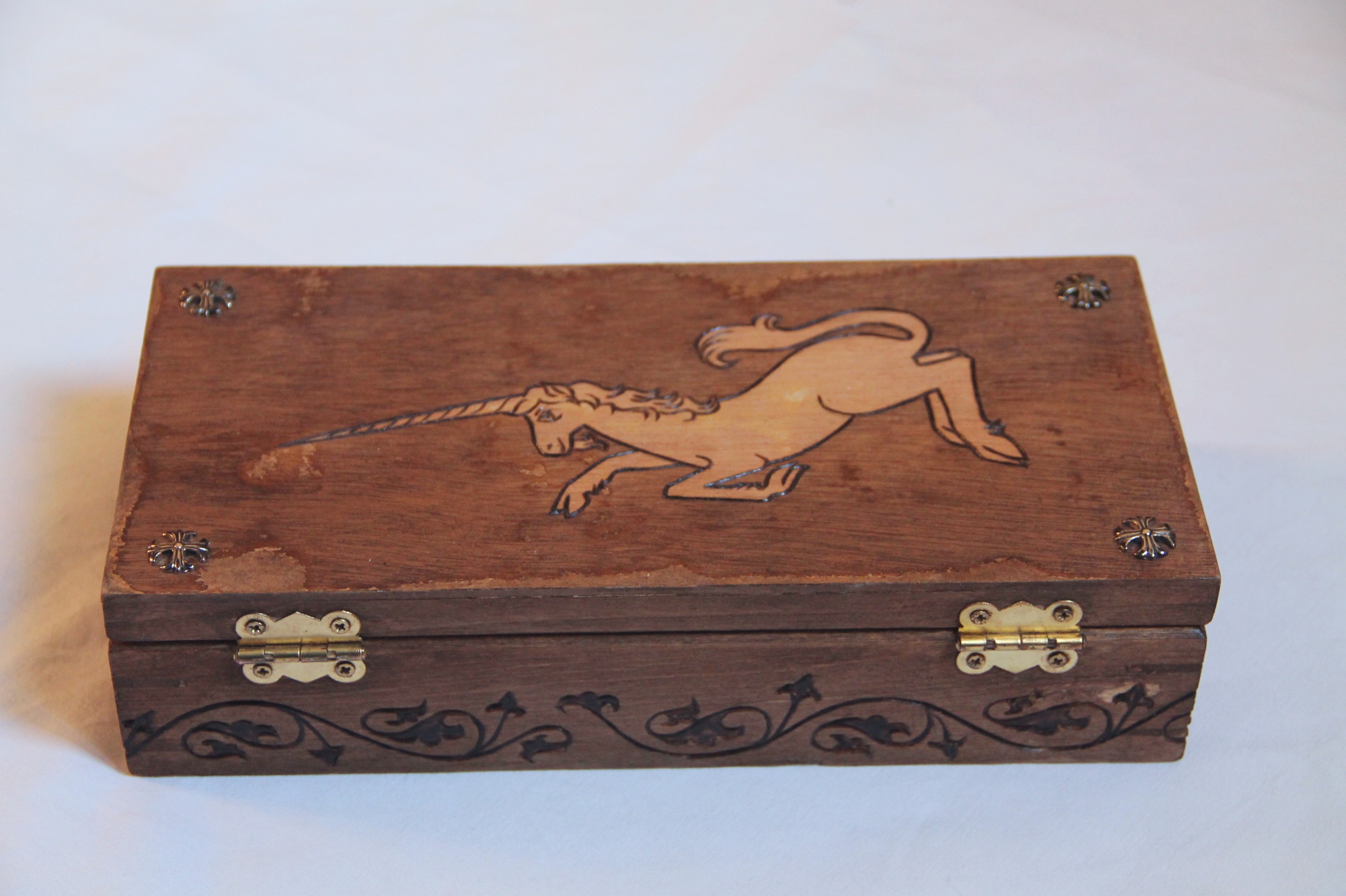 Le couvercle est gravé d'une licorne. Chaque coin est orné d'une croix en métal.