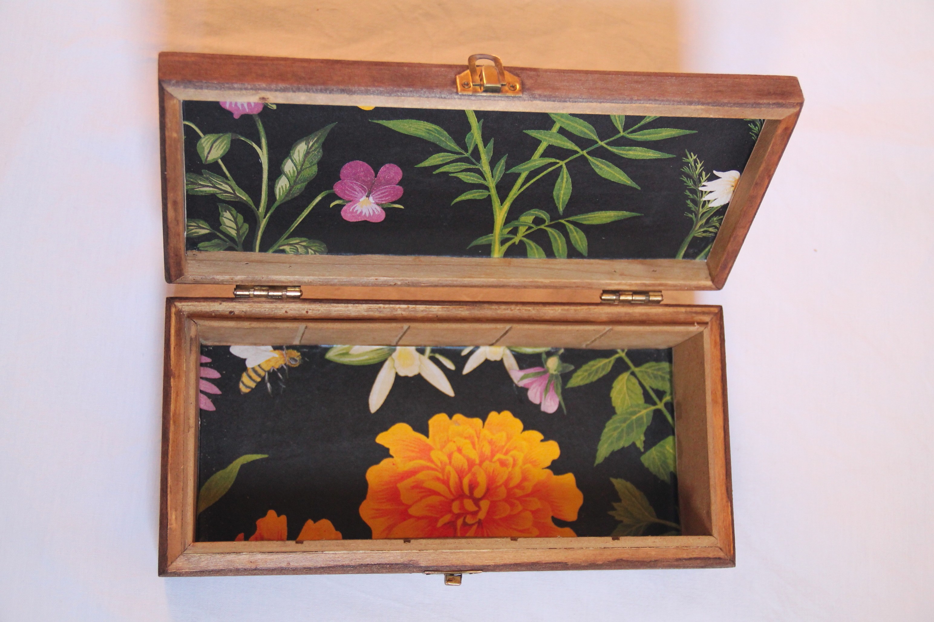 L'intérieur est tapissé d'un beau papier végétal sur fond noir.