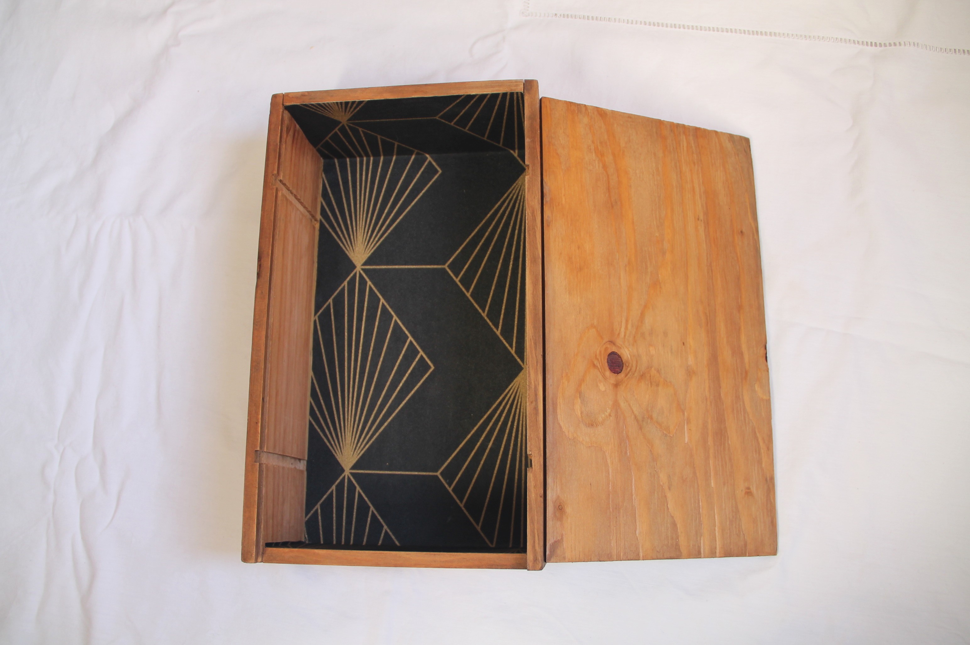 L'intérieur est décoré d'un beau papier décoratif art déco noir et doré.