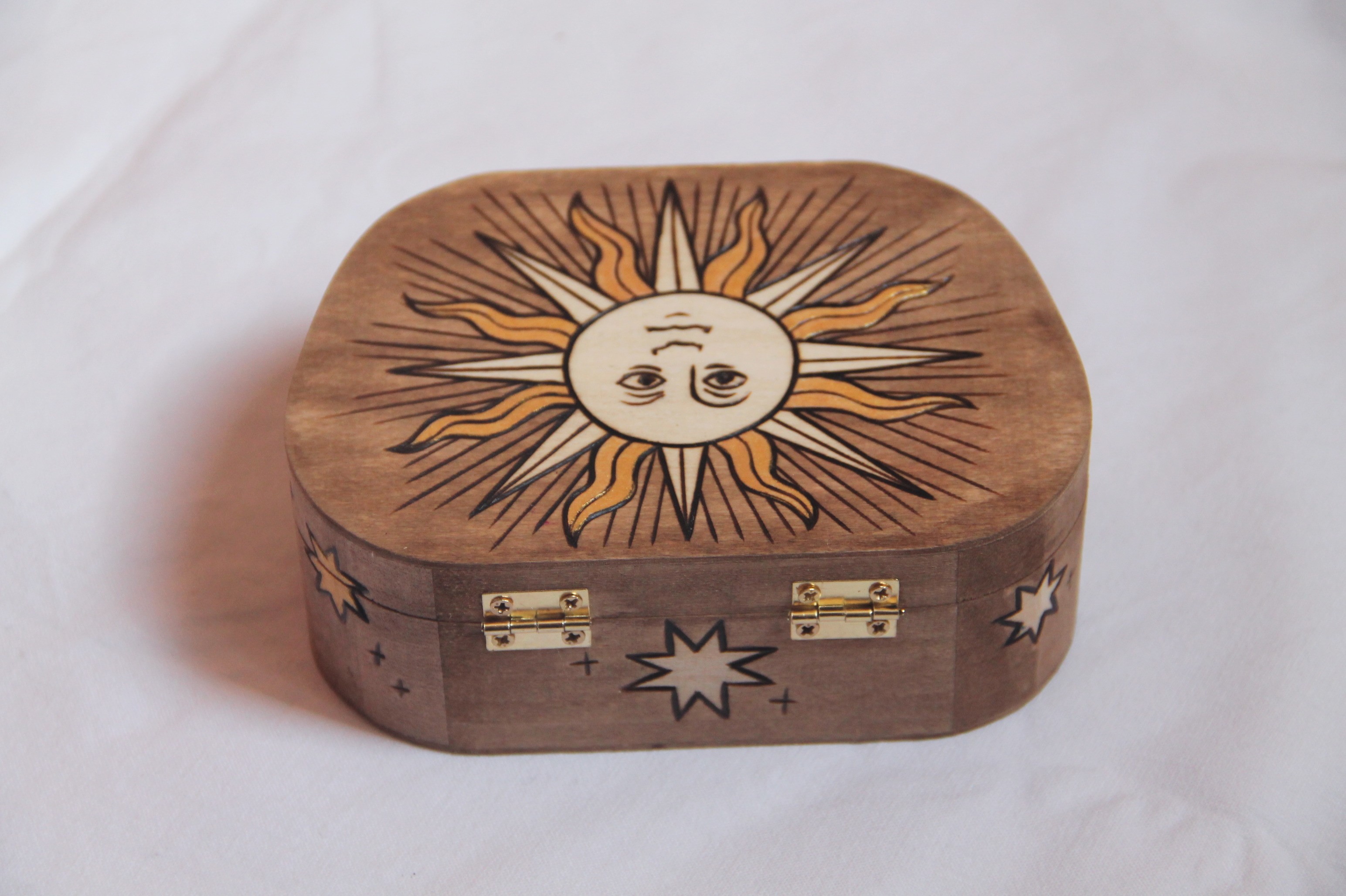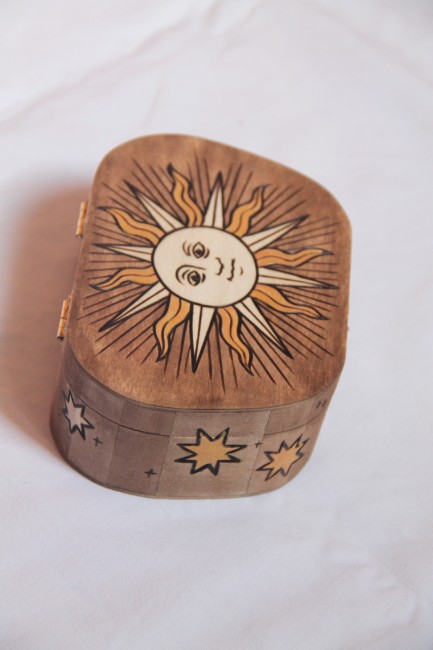 Boite en bois gravée de différents astres.
