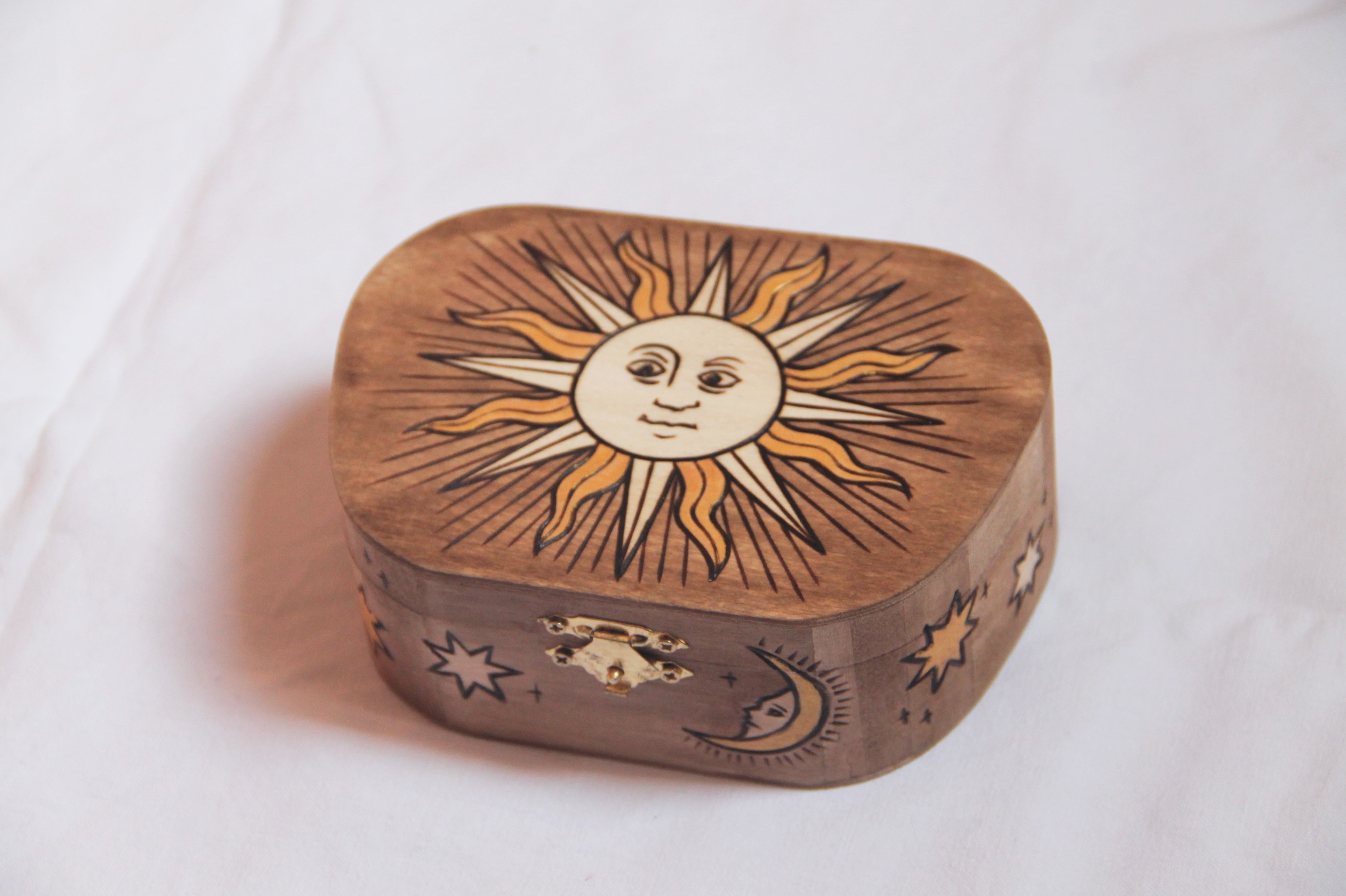Un soleil est gravé sur le couvercle, et le tour est gravé d'une lune et d'étoiles.