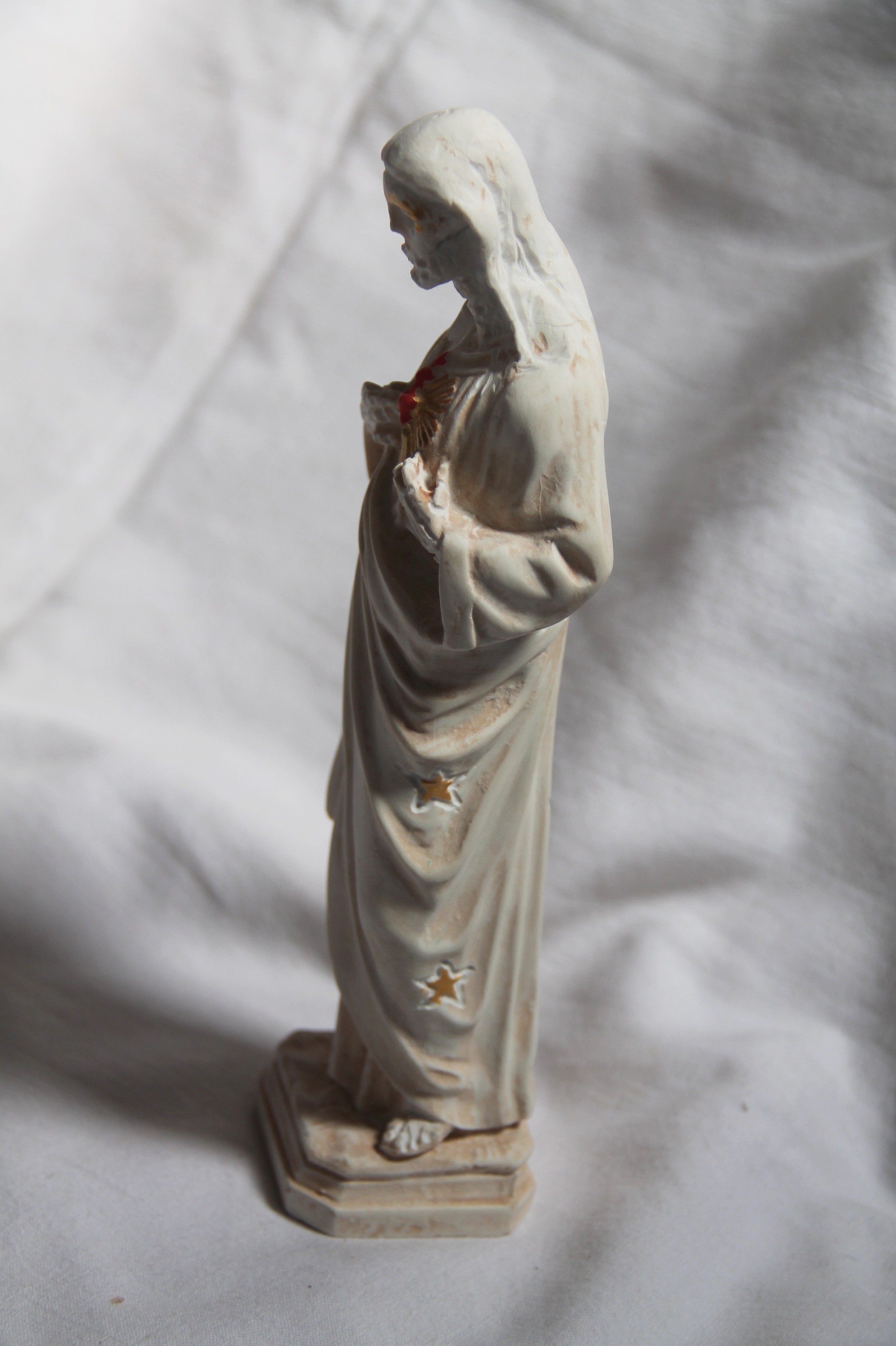 Le sacré-coeur sur sa poitrine à été peint en doré et rouge. Sa tenue est également parsemée d'étoiles dorées.