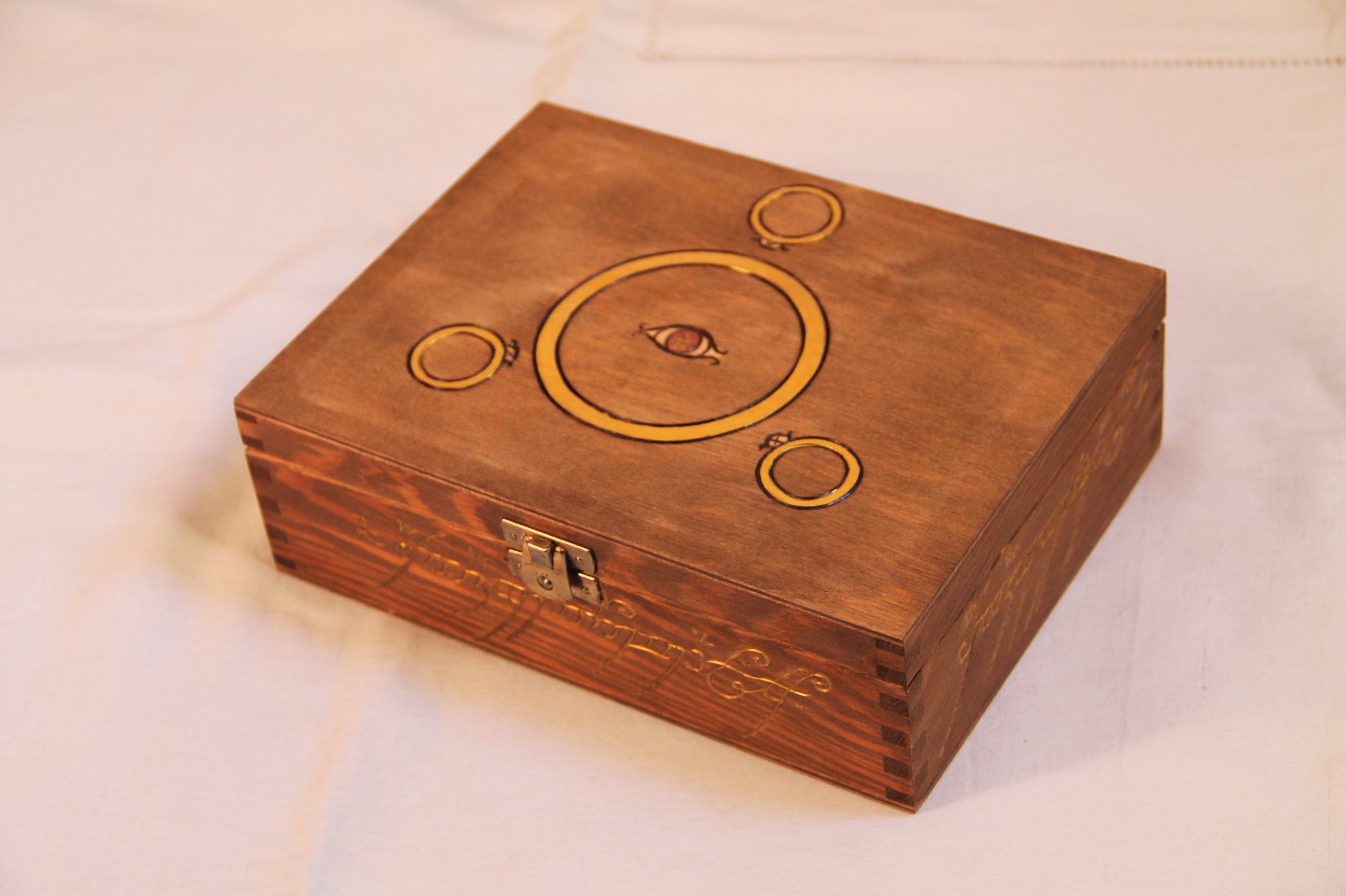 Coffret en bois vintage gravé sue le thème du Seigneur des anneaux.