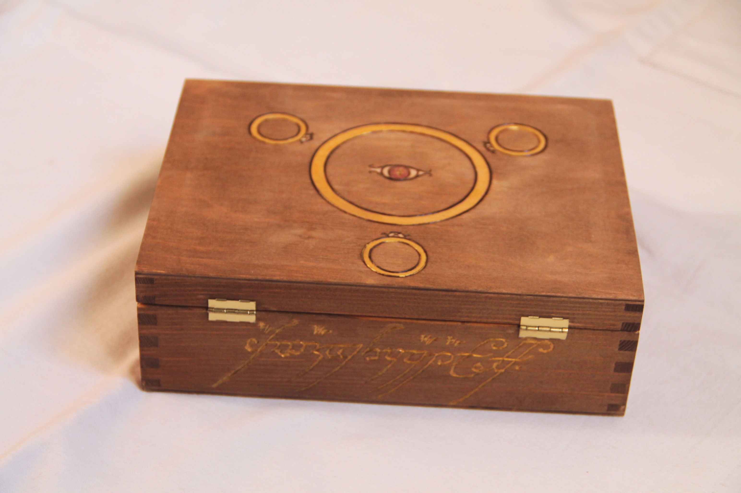 Le tour de la boite est gravé de l'inscription en noir parlé de l'anneau unique: Ash nazg durbatulûk, ash nazg gimbatul, ash nazg thrakatulûk agh burzum-ishi krimpatul. « Un Anneau pour les gouverner tous, un Anneau pour les trouver, un Anneau pour les amener tous et dans les ténèbres les lier. »