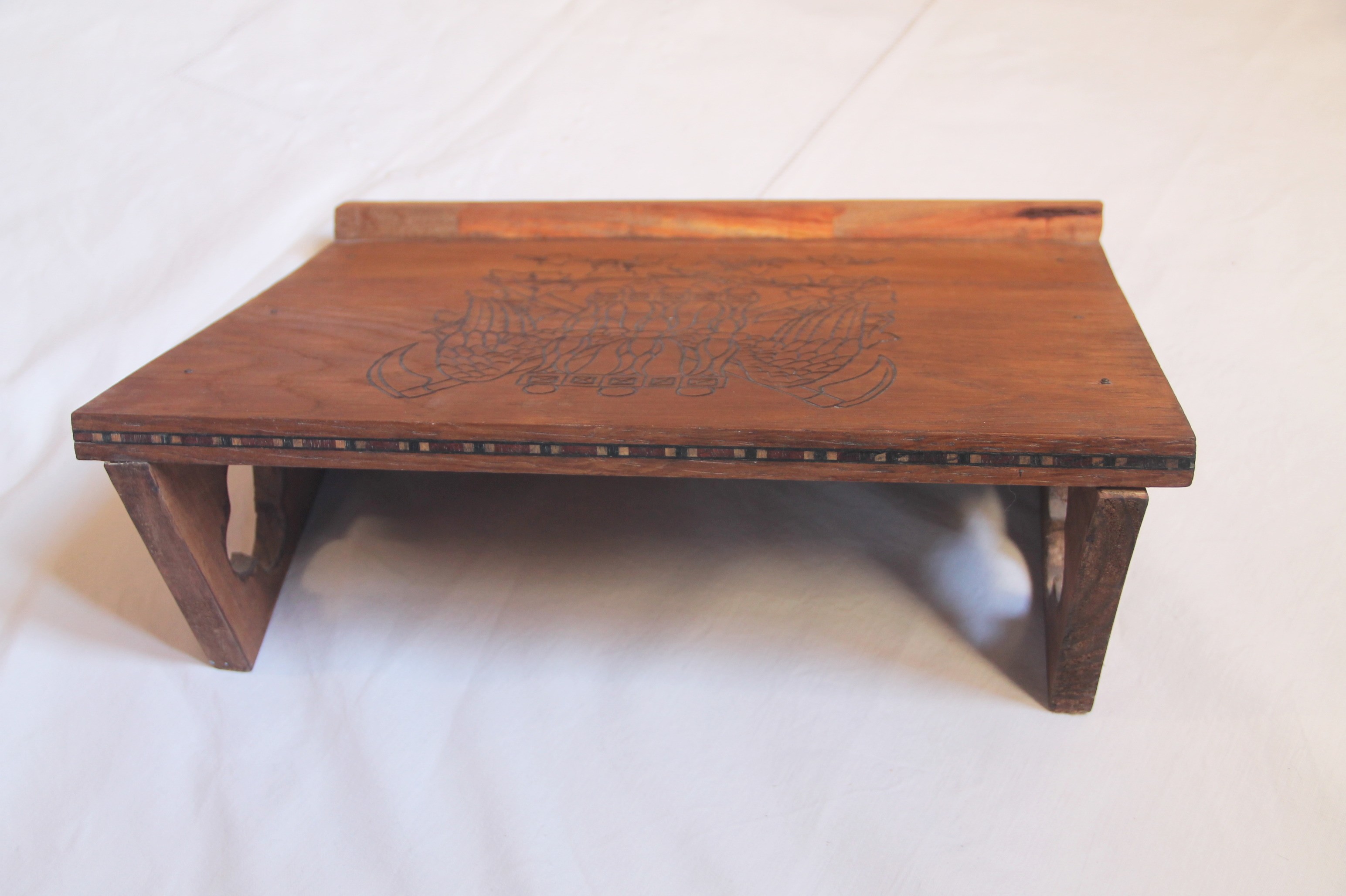 L'arrière du plateau est décoré d'une bande de marqueterie.