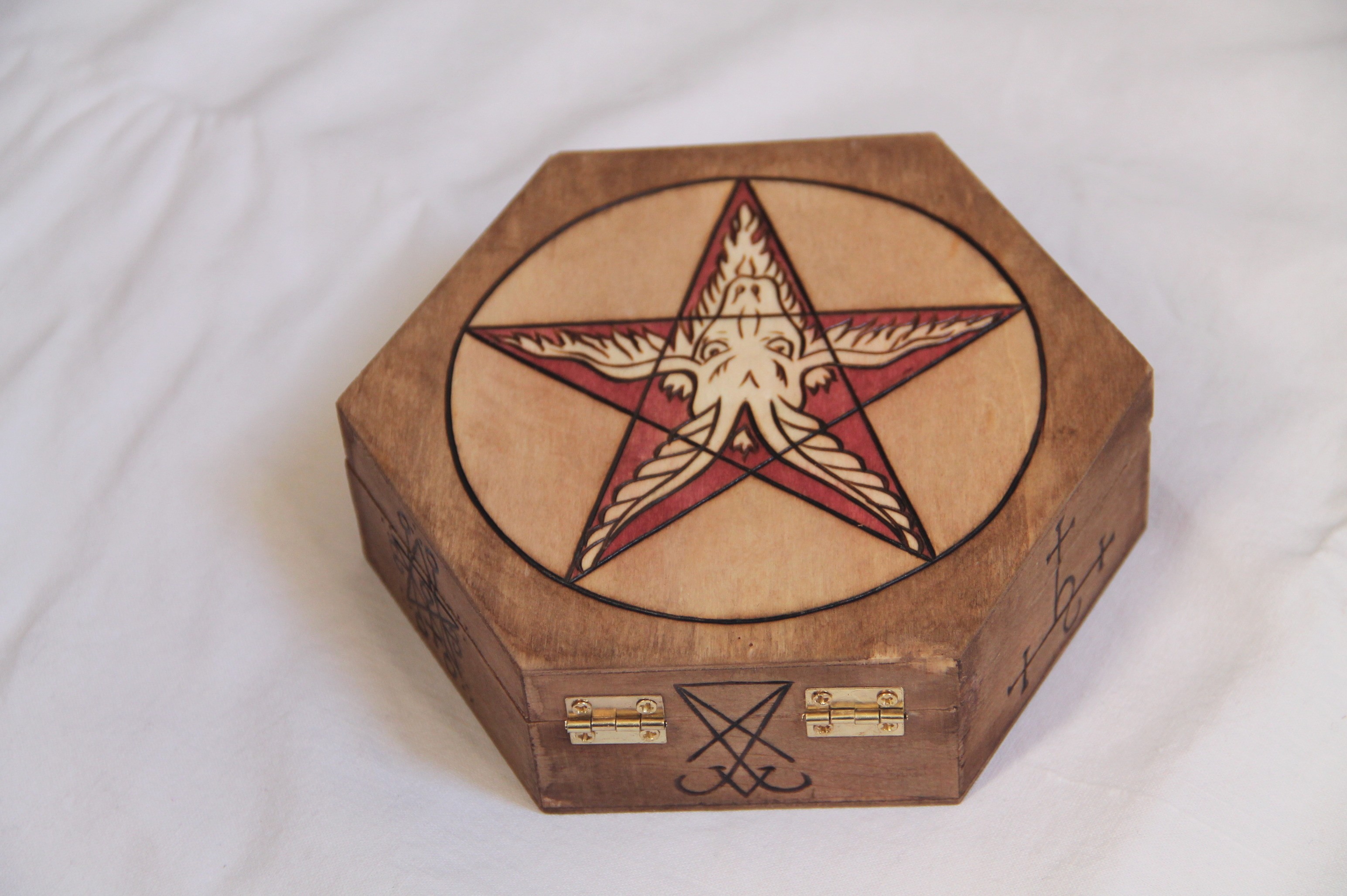 Les côtés de cette boite hexagonales sont gravés des sceaux de Lucifer, Astaroth et Lilith, chacun gravé deux fois, en face à face.