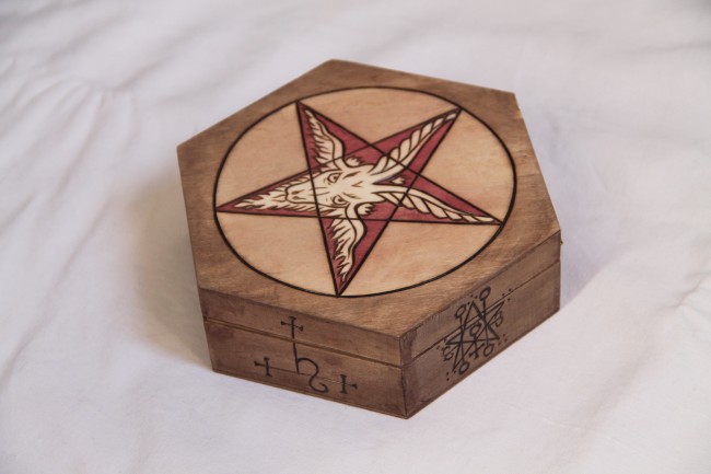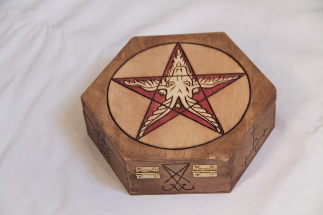 Sur le couvercle est gravé un pentagramme avec en son centre une tête de bouc: le baphomet.