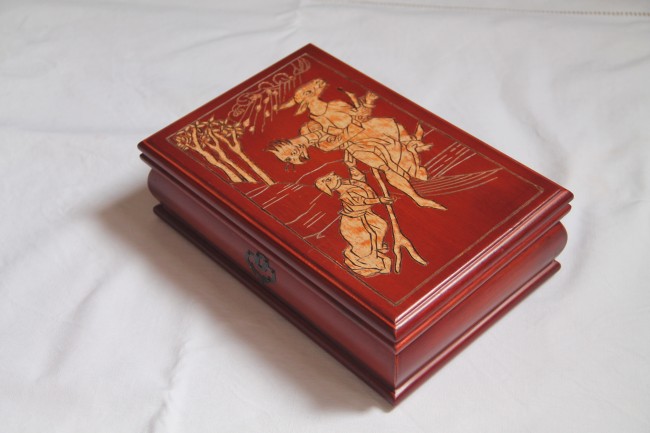 Boite vintage en bois gravée de motifs naturels dan un style victorien