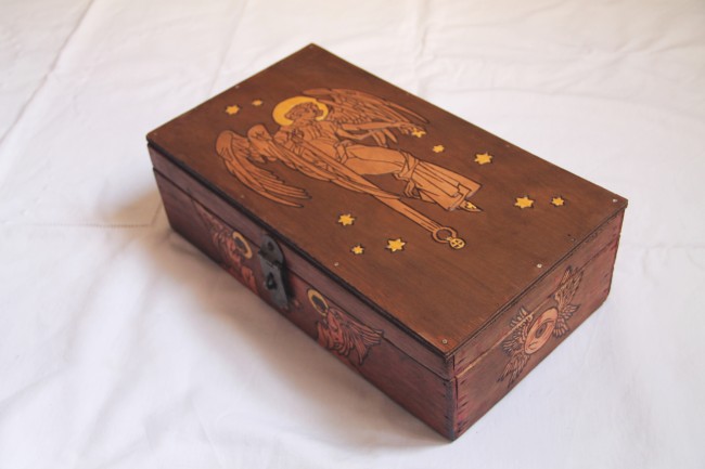 Boite vintage en bois gravé de motifs wicca, tels que la déesse mère, la lune, le triquetra, la triple spirale, et le triskel