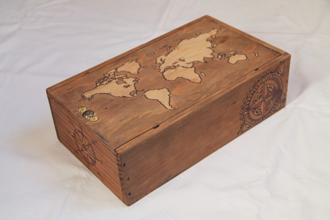 Coffret vintage en bois gravé mappemonde